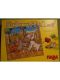 How it is played: The board shows a circular path consisting of single-colour spaces and multi-coloured dog-house spaces. Arrows next to the spaces show the direction in which the dogs move. Each player has a dog-shaped player piece. A colour die determines movement. The active player puts his/her dog on the next empty space of that colour. If he/she lands on a dog-house space, he/she is allowed to search for bones. This means that he/she puts his/her hand into the bag with the wooden bones and tries to find the bone that is shown on the top bone card. While he/she is trying to identify the correct bone by touch, the other players continue taking turns rolling the die and moving their dogs. As soon as the active player thinks he/she has found the correct bone, he/she shouts "Stop!" and the other players stop rolling. The chosen bone is compared to the one on the card. If they match, the active player gets to keep the card. The wooden bone is returned to the bag. Then the active player starts searching for the next bone. His/her turn ends as soon as either one of the other players lands on a dog-house space, or he/she chooses the wrong bone.