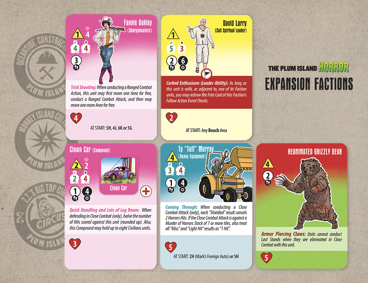 As a Faction, the Oceanside Construction Company has a “control” style of play. In other words, they focus on controlling the movement of Horrors units and tend to excel in dealing with those really big Murder of Horrors stacks. As can be seen in the Faction Spoiler graphic, Ty "Tuff" Murray's special ability fully activates when in Close Combat with a Murder of Horrors Stack that is at least seven Tiles tall.